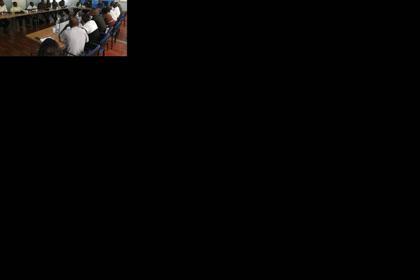 Echanges entre le président du Tribunal Militaire de Garnison d’Uvira, Major GIONGENGA LWANZU Alain, et les journalistes dans la salle de conférence au quartier général de la MONUSCO à Uvira. Photo MONUSCO/Fiston NGOMA…