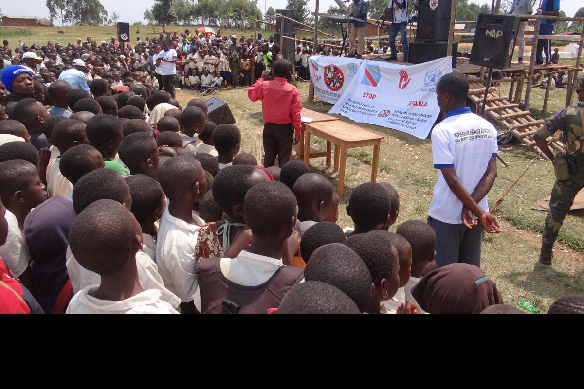 Journée de lutte contre le recrutement d'enfants dans les groupes armés à Butembo. Photo MONUSCO/Alain Coulibaly Butembo, le 16 février 2018 – La Section protection de l’enfant de la MONUSCO, en présence des représentants des…