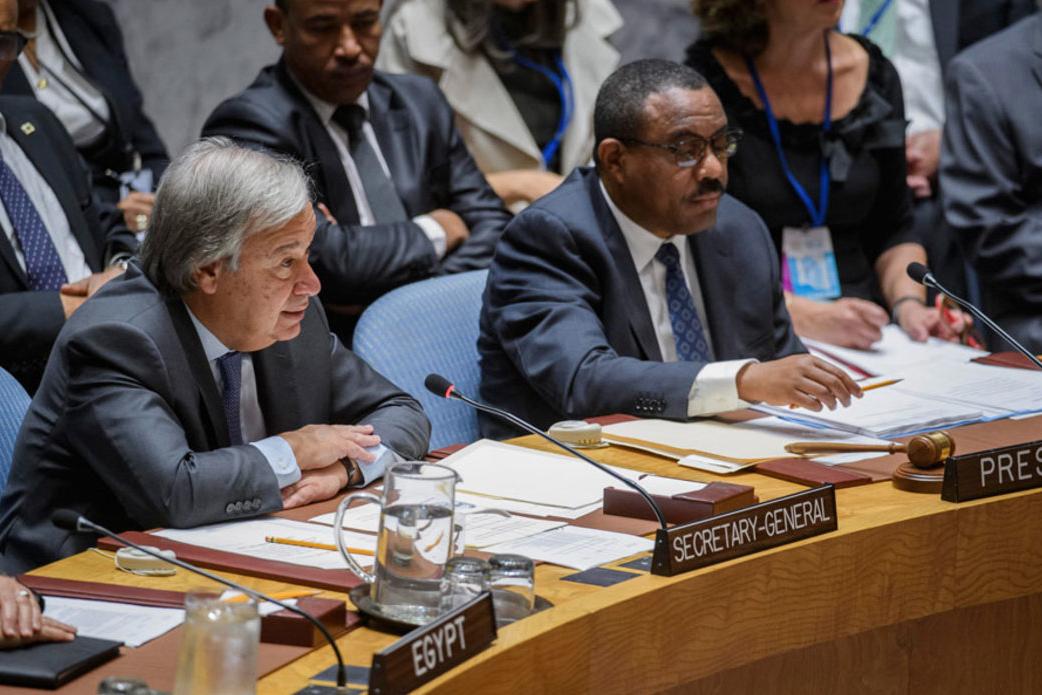 Le Secrétaire général de l’ONU, António Guterres (à gauche) devant le Conseil de sécurité. A sa droite, le Premier ministre d’Ethiopie, Hailmariam Dessalegn, dont le pays préside le Conseil de sécurité en septembre. Photo ONU…