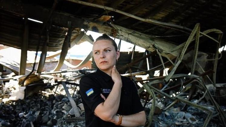 Виктория Кучерява осторожно ступает между грудами сковородок, терок и почерневшей от копоти посуды. Это все, что осталось от склада кухонной утвари на окраине Киева после авиаудара. Стены и крыша здания покосились, после сильного пожара все вокруг покрыто пеплом.